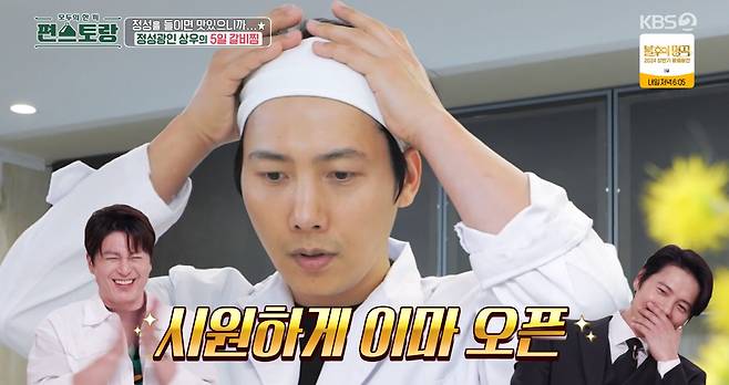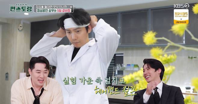잠시 후 요리 준비를 시작한 이상우는 상상 초월 복장으로 주방에 나타났다. 마치 의식을 치르듯 경건하게 흰색 가운을 걸치더니 헤어밴드까지 장착, 시원하게 이마를 드러낸 것. 이상우는 "대학 때 식품생명공학과를 다녔는데 그때 입던 실험복이다. 앞치마 대신 입는다. 이걸 입고 요리하면 소연이가 좋아한다"라고 설명했다. 언뜻 보면 실험실인가 싶은 이상우의 복장은 요리하는 내내 시선을 강탈해 웃음을 줬다.