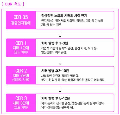 대표적으로 CDR(Clinical Dementia Rating) 검사는 치매 전문의가 실시하는 치매척도검사로써 여러 평가 항목(기억, 오리엔테이션, 판단 및 문제 해결, 커뮤니티, 가정 및 취미)을 통해 치매의 단계 및 정도를 판단하는 검사이다. CDR 검사를 받으면 통상 CDR 0등급 ~ CDR 3등급 사이에서 평가 된다. 'CDR 0'은 정상을 의미하고, 'CDR 0.5'는 경증인지장애(불확실, 가벼운 인지장애), 'CDR 1'은 경도치매, 'CDR 2'는 중등도치매, 'CDR 3'은 고도 치매라고 한다(CDR 4는 심각한 치매, CDR 5는 치매 말기).