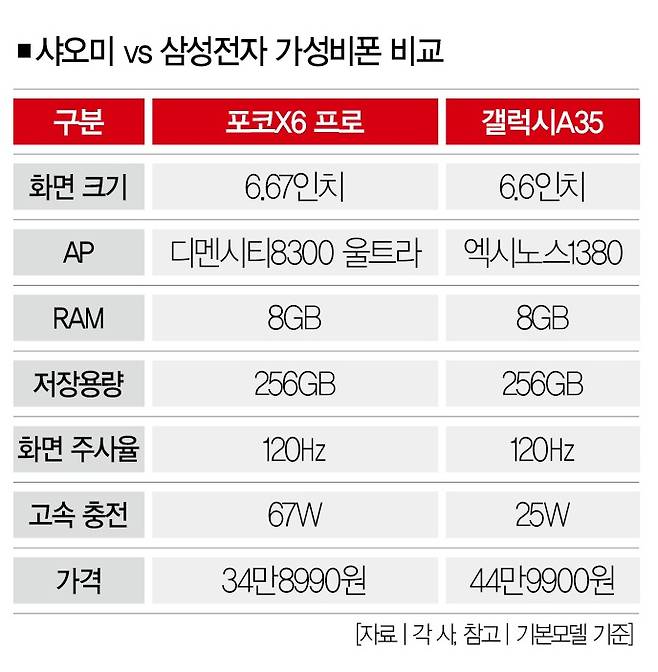 그건 샤오미가 스마트폰의 두뇌에 해당하는 AP(애플리케이션 프로세서)에 역량을 쏟아부은 덕분으로 풀이됩니다. 이 모델에는 '디멘시티8300 울트라'가 AP로 탑재돼 있습니다. 업계에선 이 부품의 성능이 삼성전자가 2022년 출시한 플래그십 스마트폰 '갤럭시S22 울트라'의 AP(스냅드래곤8 Gen1)와 비슷한 수준인 것으로 평가하고 있습니다. 쉽게 말해, 포코X6 프로가 2년 전에 유행했던 고사양 스마트폰의 성능을 지녔다는 얘기죠.