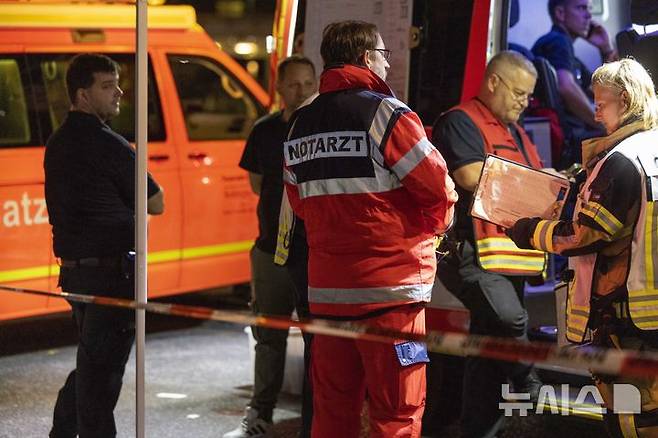 [졸링겐=AP/뉴시스] 23일(현지시각) 독일 서부 노르트라인베스트팔레주 졸링겐의 축제장에서 흉기 난동이 발생해 긴급 구조대가 현장에서 작업하고 있다. 현지 경찰은 졸링겐의 프론호프 광장에서 열린 도시 설립 650주년 기념 축제에 한 괴한이 난입해 흉기 난동을 벌여 3명이 숨지고 4명이 다쳤다고 밝혔다. 범인은 도주 중인 것으로 알려졌다. 2024.08.24.