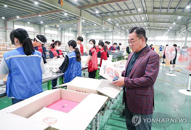 (서울=연합뉴스) 이대영 한국교과서협회 이사장이 24일 경기 파주시 한국교과서협회 물류센터에서 2025학년도부터 사용할 교과서 전시본을 둘러보고 있다. 2024.8.24 [한국교과서협회 제공. 재판매 및 DB 금지]