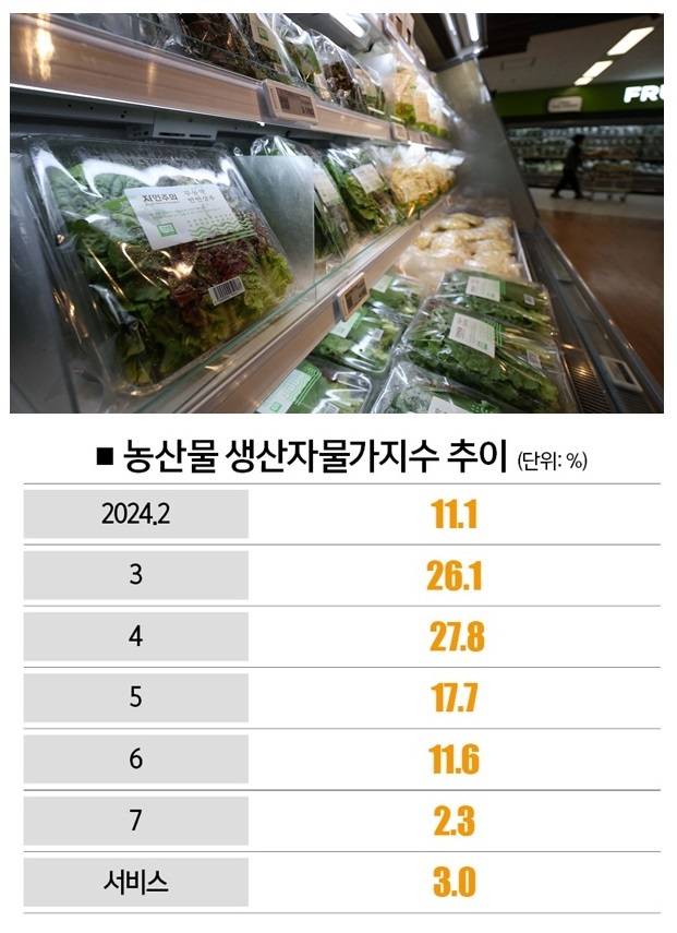 한국은행이 발표한 7월 생산자물가지수에 따르면, 농산물 생산자물가지수 상승률은 7월 2.3%(전년 동월 대비)로 떨어졌다. 2월 이후 이어지던 두자릿 수 상승률(2월 11.1%→3월 26.1%→4월 27.8%→5월 17.7%→6월 11.6%)이 한 자릿수로 내려앉았다.
