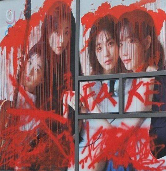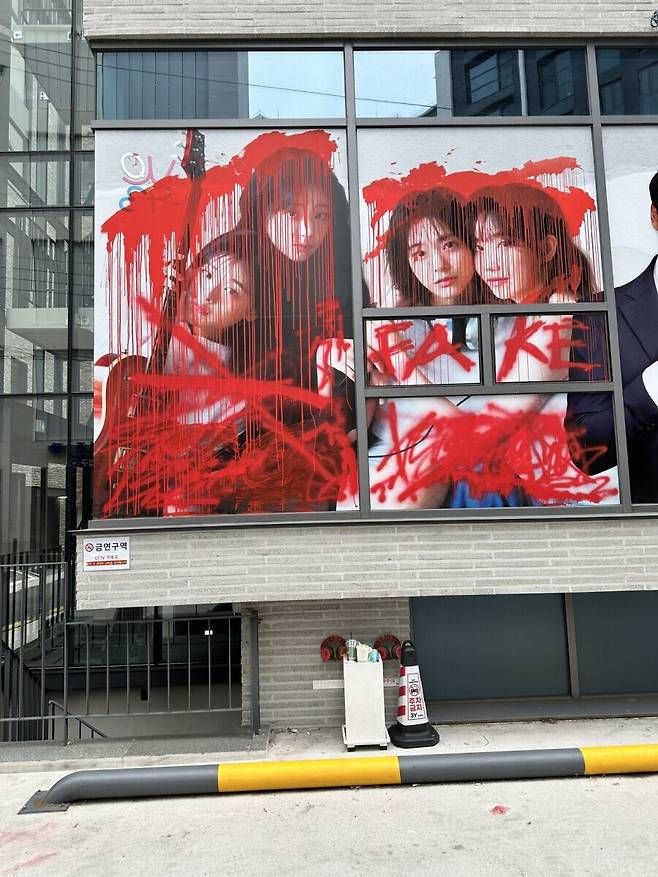 해당 사진은 서울시 강남구 논현동에 위치한 3Y코퍼레이션(쓰리와이코퍼레이션) 사무실 외벽 창문에 게재된 것으로 다른 연예인들 QWER 멤버들의 사진에 붉은색 페인트가 뿌려져 있고 'FAKE'라고 적혀져 충격을 안겼다.