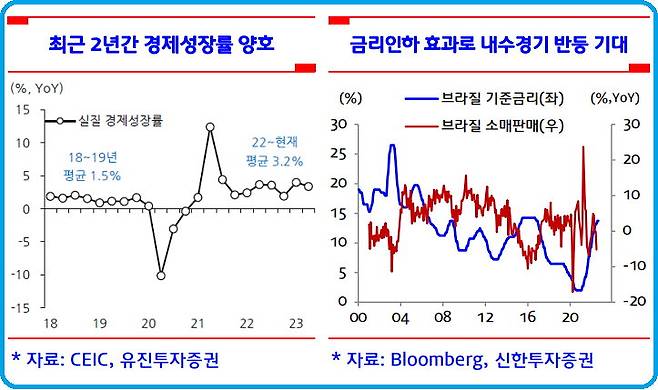 룰라정부 이후 최근 2년간 경제성장률은 평균 3.2%다. 2018년과 2019년의 평균 1.5%의 성장과 비교할 때 양호한 모습이다. 올해 성장 전망치는 2.05%다. 원자재 가격하락과 중국의 경기둔화에 따른 무역흑자 축소 우려를 선반영한 수치다. 빠른 금리인하 조치로 하반기부터는 내수중심의 경기반등이 예상된다. 연말로 갈수록 성장 전망치는 상향조정될 것으로 예상된다. 15%에 가까웠던 실업률이 최근 7%대까지 하락하는 등 고용개선을 보이고 있어 내수경기 개선에 긍정적인 요소라 판단된다.