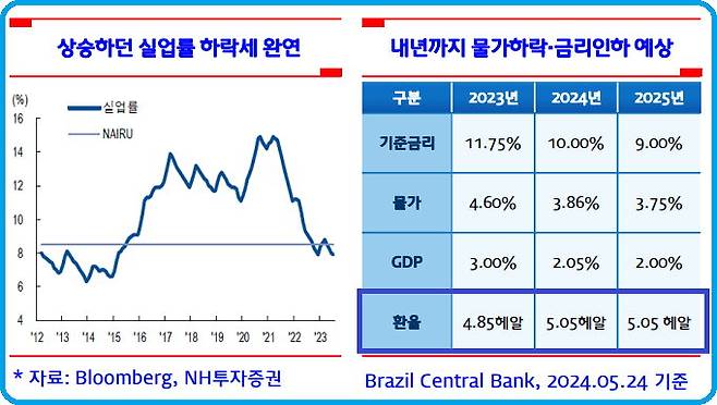 따라서 현 시점 투자자의 입장에서는 브라질 국가재정의 건전성과 환율의 움직임을 유심히 살펴보아야 하는데, 대부분의 시장 견해는 헤알화 가치의 하방리스크(Risk)는 어느 정도 제한된다는 입장이다. 코로나 팬데믹(Pandemic) 이후 비교적 안정적인 움직임을 보였던 헤알화 가치가 6월 하락하기도 했다. 헤알화 대비 원화환율이 240원대까지 내리기도 했는데 이때는 룰라 행정부의 정치적 리스크(Risk)와 외국인들의 자금 이탈, 그리고 재정 불안정성 등이 반영되었기 때문이라는 분석이다.