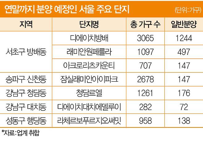 분양가가 오르고 당첨 확률이 희박해졌지만 올 하반기 서울 아파트 분양을 눈여겨봐야 하는 이유는 있다. 올 연말까지 일반분양되는 물량(3043가구) 가운데 분양가상한제가 적용되는 규제지역(강남·서초·송파·용산구)에서 나오는 일반분양 물량만 4개 단지, 2438가구에 달한다. 2008년 금융위기 이후 보지 못한 큰 장이다.