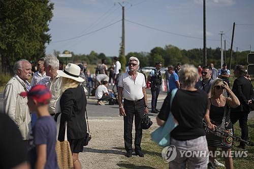 People pay tribute to late French actor Alain Delon, at the entrance gate of Delon's property, in Douchy, central France, Saturday, Aug. 24, 2024. Delon, the internationally acclaimed French actor who embodied both the bad guy and the policeman and made hearts throb around the world, died at age 88. (AP Photo/Thibault Camus)
