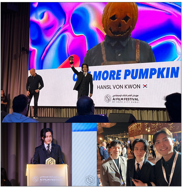 두바이에서 열린 국제AI영화제에서 대상과 관객상 2관왕을 차지한 권한슬 감독팀 (설한울 연구소장, 권한슬 감독, 구도형 프로듀서) ⓒ AIFF Dubai