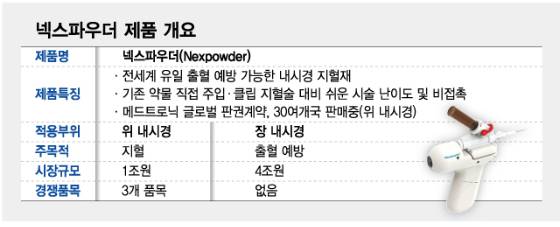 넥스파우더는 소화 내시경 시술 과정에서 발생하는 출혈을 막는 파우더형 지혈재다. 물과 만나면 접착성 겔이되는 고분자 물질이 기반이다. 어려운 시술 난이도와 직접적 조직 접촉이 요구되는 기존 지혈술(약물, 전극봉, 클립) 대비 의료진과 환자 접근성이 좋은 것이 장점이다.