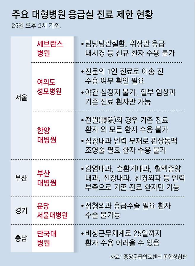 의료공백으로 기존 내원 및 입원 환자 위주로 응급환자를 받는 대형병원도 적지 않다. 25일 부산대병원은 중앙응급의료센터 종합상황판을 통해 ‘감염내과, 순환기내과, 혈액종양내과, 신장내과, 신경외과 등의 진료 인력 부족으로 기존 내원 환자만 진료 가능하다’고 공지했다. 모두 심혈관질환, 암 등 고령 환자의 발생 빈도가 높은 질환을 다루는 진료과들이다. 한양대병원도 이날 ‘기존 환자 외엔 전원(轉院)이 불가능하고, 심장내과 인력 부재로 관상동맥조영술 환자 수용 불가’라고 밝혔다. 이형민 대한응급의학의사회장은 “요양병원에 오래 있던 분들은 원래 다니던 병원이 없는 경우가 많아 더 전원이 어려운 상황”이라고 말했다.
