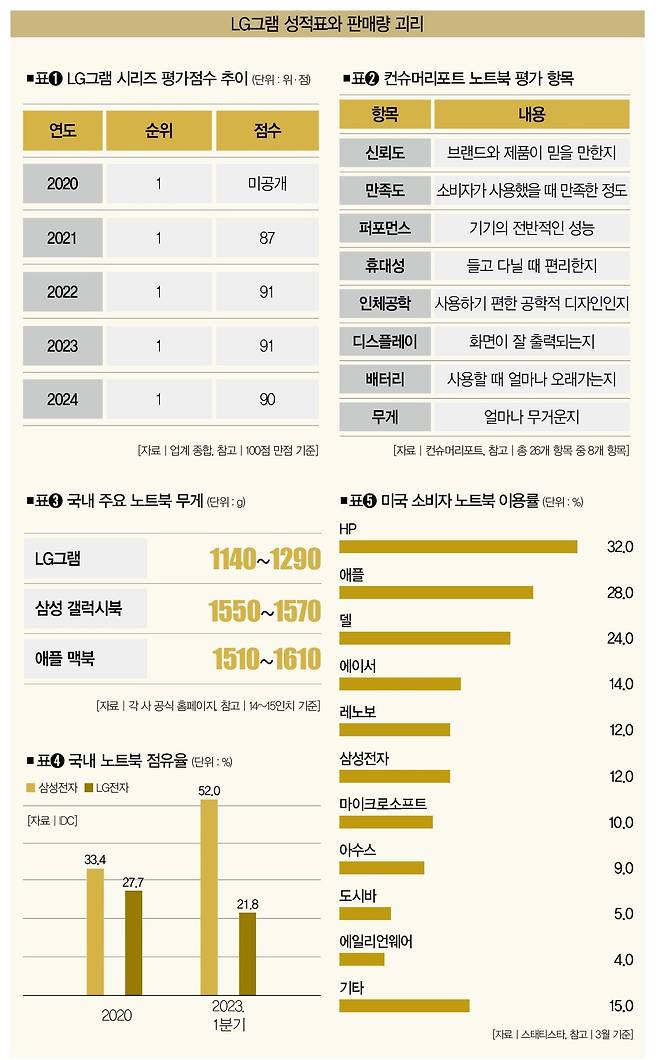 하지만 전례前例를 살펴보면 그렇지 않다. 컨슈머리포트는 매년 시중에 판매되는 노트북의 기능과 휴대성을 평가해 순위를 매기는데, LG그램은 2020년부터 올해까지 전체 노트북 부문 1위 자리를 지켜왔다. 그런데도 시장점유율은 크게 달라지지 않았다. 일례로, 삼성전자 노트북의 국내 시장점유율은 2020년 33.4%에서 2023년 52.0%로 18.6%포인트 커졌지만, LG전자의 점유율은 같은 기간 5.9%포인트(2020년 27.7% →2023년 21.8%) 빠졌다(표➍).