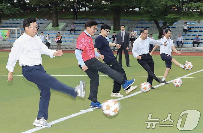 (서울=뉴스1) 김민지 기자 = 우원식 국회의장, 한동훈 국민의힘 대표, 박찬대 민주당 원내대표 등이 26일 오후 서울 여의도 국회운동장에서 열린 제22대 국회 개원 기념 여야 국회의원 축구대회에 시축하고 있다. 2024.8.26/뉴스1