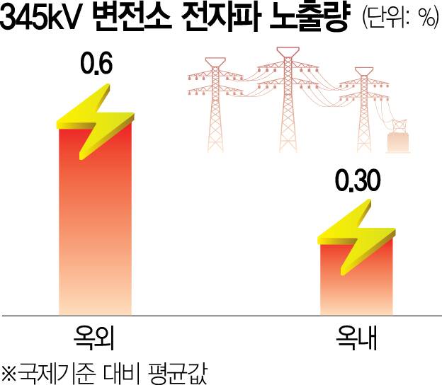 26일 한국전력공사가 국내 150개 변전소를 대상으로 전자파 노출량을 조사해 한국전기학회에 게재한 ‘국내 변전소 형태에 따른 전자파 노출량 측정 및 분석’ 논문에 따르면 345㎸와 154㎸ 변전소의 평균 전자파 노출량은 국제 기준인 83.3μT(마이크로테슬라)의 0.04~0.81%인 것으로 조사됐다. 해당 연구는 한전 전력연구원과 송변전건설처 소속 직원들이 변전소 외부 울타리 주변 측정치를 바탕으로 작성했다.