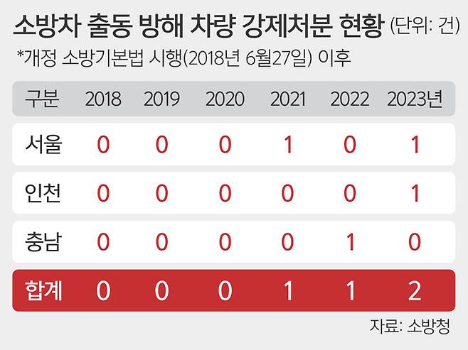 26일 소방청에 따르면 올해 소방차의 현장 진입을 막는 불법주차 차량을 강제처분한 사례는 한 건도 없다. 실제 주정차된 자동차에 가로막혀 사다리차 등 소방차량이 진입하지 못해 화재 피해를 키우는 상황이 반복되고 있으나, 현장에서 차량 강제처분은 거의 실시되지 못하고 있는 것이다.