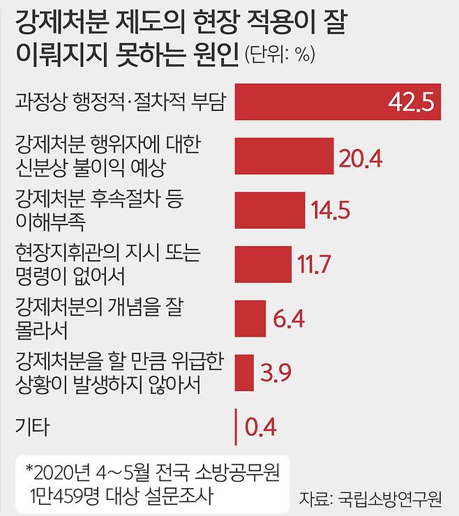 이용재 경민대 교수(소방안전관리)는 “(강제처분에 대한) 면책특권 등 법이 많이 개선된 것은 사실”이라면서도 “현장 소방공무원 입장에서도 구상권 등 책임 소재를 두고 논란에 휘말리게 되면 부담인 데다 승진에도 영향받을 수 있다는 생각에 현실적으로 어려운 상황”이라고 설명했다.