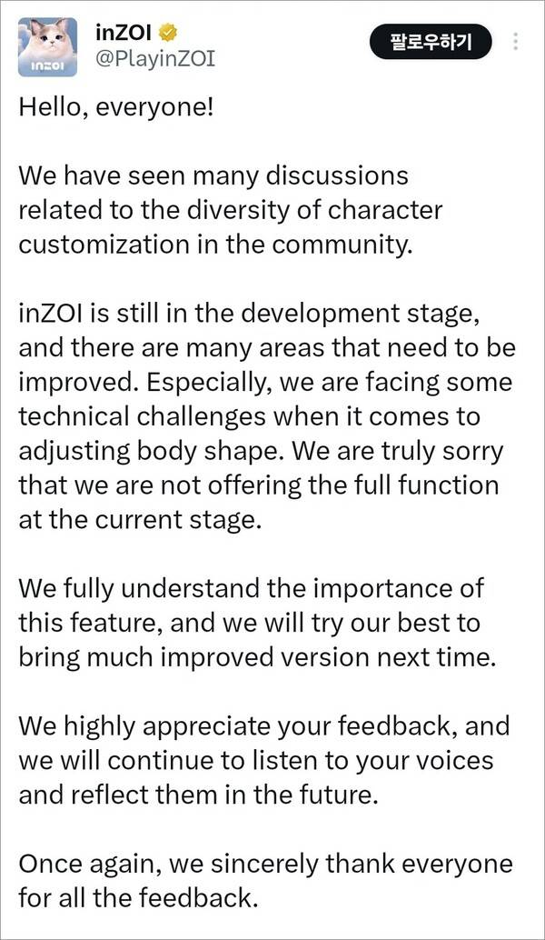 크래프톤은 "커뮤니티에서 캐릭터 커스터마이징의 다양성 관련 토론을 확인했다. 인조이는 아직 개발 단계다. 개선해야 할 요소가 많다. 특히 체형 조정에 기술적 난관을 겪고 있다. 캐릭터 스튜디오로 전체 기능을 제공하지 못해 죄송하다"고 설명했다.