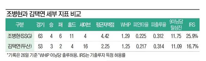 조병현의 시즌 성적은 26일 기준으로 4승 6패 11홀드 4세이브 평균자책점 4.42이다. 중간계투와 마무리 투수를 오가는 전천후 필승조. 8월 초부터는 노경은과 더블 스토퍼로 뒷문을 책임지고 있다. 세이브가 김택연의 무기라면 조병현은 홀드. 올해 신인 최다인 59이닝을 책임지며 신인 최다 홀드로 신인왕 레이스에 뛰어들었다.