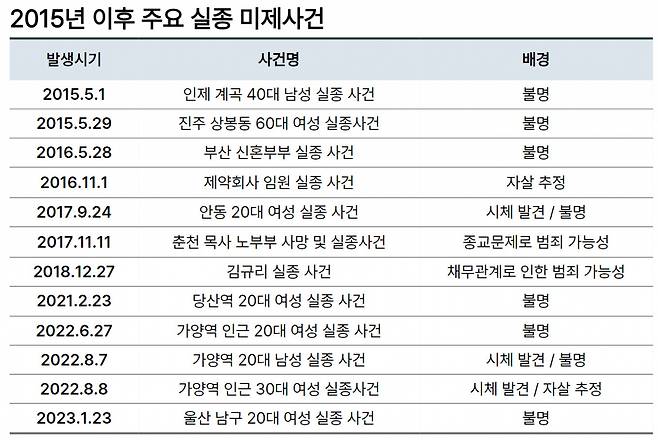 어른의 ‘위험한 실종’은 대개 3가지 틀로 나눠볼 수 있다. 헤럴드경제가 2015년 이후 언론에 보도된 성인 실종 사건 가운데 아직까지 명확한 배경이 파악되지 않은 15건을 분석했다. 실종의 배경을 보면 ▷스스로 목숨을 끊거나(신변비관·우울) ▷원한·채무관계 등에 의한 범죄(살해)로 추정되거나 ▷전북대 수의대생 이윤희 씨의 사건처럼 이유를 알 수 없는 이유(미제)로 남는 경우도 많다.