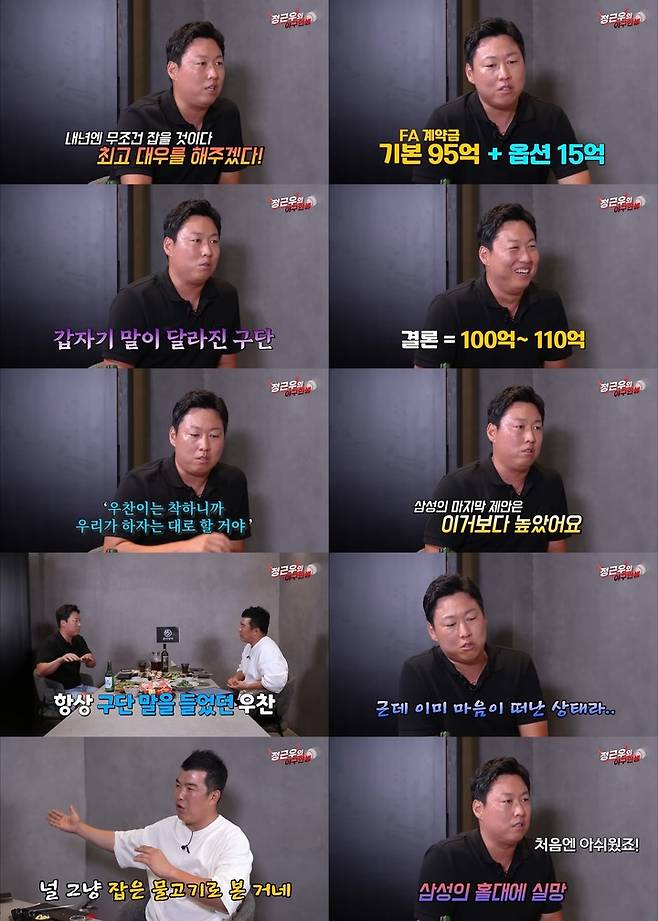 26일 공개된 유튜브 채널 '정근우의 야구인생'에 출연한 차우찬은 2016년 FA 당시 상황을 밝히며 "구단에서 나를 잡을 것이라고 공개적으로 얘기하고 최고 대우를 해주겠다고까지 말했는데 막상 협상에 들어가니 말했던 금액이 아니었다"며 "평소 구단 말을 잘 들어왔으니 '우찬이는 이렇게 하자고 하면 할 거야'라고 생각했던 것 같다"고 말했다.