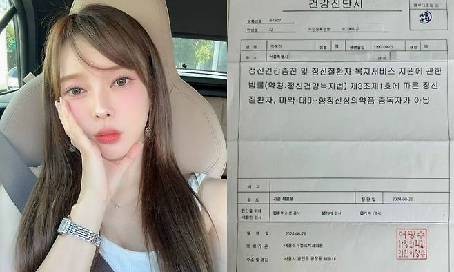 이와 함께 공개한 건강진단서에는 '정신건강증진 및 정신질환자 복지서비스 지원에 관한 법률(약칭: 정신겅강복지법) 제3조제1호에 따른 정신질환자, 마약·대마·향정신성의약품 중독자가 아님'이라는 내용이 담겨있다.