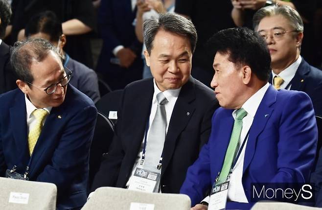 양종희 KB금융지주 회장(왼쪽부터), 진옥동 신한금융지주 회장, 함영주 하나금융지주 회장이 27일 서울 중구 을지로 동대문디자인플라자(이하 DDP)에서 진행되는 글로벌 핀테크 박람회 '코리아 핀테크 위크 2024'에 참석, 대화를 나누고 있다.