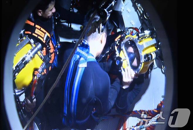 (서울=뉴스1) = 27일 해군 해난구조전대 종합구조훈련에 참가한 심해잠수사들이 포화잠수용 인원 이송 캡슐에서 포화잠수 준비를 하고 있다. (해군 제공) 2024.8.27/뉴스1