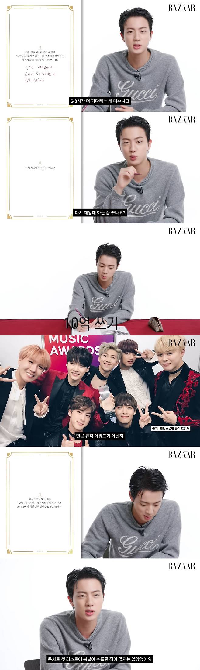화보 촬영 이후 진은 '바자 코리아'가 선정한 질문에 답을 하는 질의응답 형식의 인터뷰를 진행했다. 이 인터뷰에서 진은 '최근 기억에 남는 응원이 있었나?'라는 질문에 "현장에서 워낙 많은 소리가 오가서 정신 없었는데 나중에 프랑스 팬이 인터뷰한 걸 봤다. 군 생활로 나를 일년 반 기다렸는데 지금 6~8시간 기다리는 게 뭐 대수냐고 하더라. 더 기다릴 수 있다고 말해줘 기억에 남는다"고 팬사랑을 전했다.