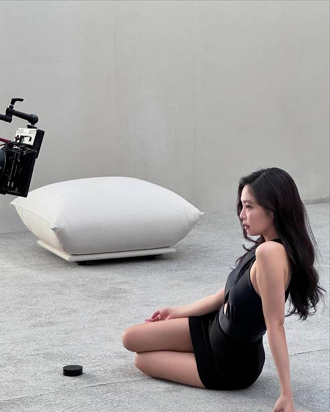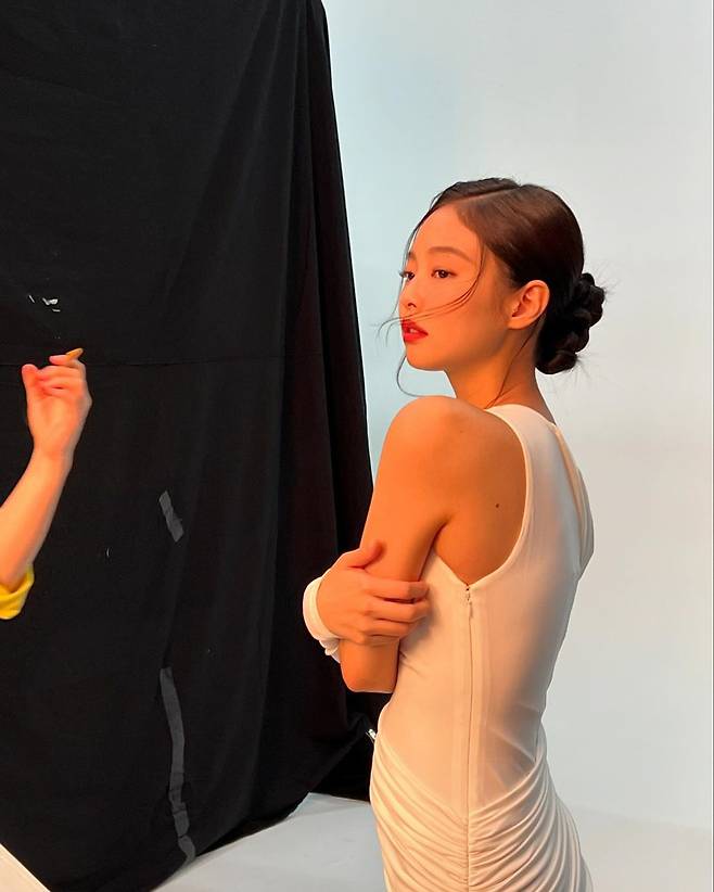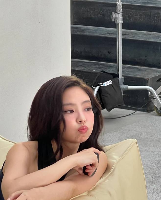 제니는 27일 화장품 광고 촬영 중인 비하인드를 공개했다.