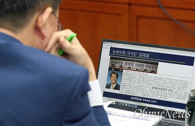 그러자 신장식 조국혁신당 의원은 김 차장에게 직접적으로 "뉴라이트이신가?"라고 물었다. 김 차장은 "아니다"라고 부인했지만, 신장식 의원은 "2007년 대통령 선거 당시 '이명박 대통령 후보를 지지하는 뉴라이트 지식인 선언 100명'"을 화면에 띄우며 "여기 김태효 차장 이름 올리신 거 맞지?"라고 따져 물었다.