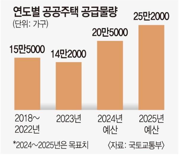 27일 국무회의에서 확정된 ‘2025년도 예산안’에 따르면 정부는 14조8996억원을 투입해 내년 한 해 동안 종전 대비 4만7000가구 늘린 25만2000가구(분양 10만 가구, 임대 15만2000가구)의 공공주택을 공급한다. 관련 예산은 지난해(18조1276억원)보다 3조2280억원 감소했지만 착공 초기 한국토지주택공사(LH)에 한꺼번에 지급했던 예산을 3년에 나눠 지급하기로 한 데 따른 결과다.