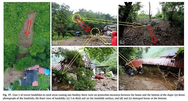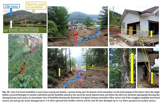 | ▲ 2017년 청주시 상당구 미원면의 산사태 관련 이수곤 교수 해외 학회지에 실린 논문. 벌목하고 소나무 조림한 곳에서 산사태가 시작되었다. |
