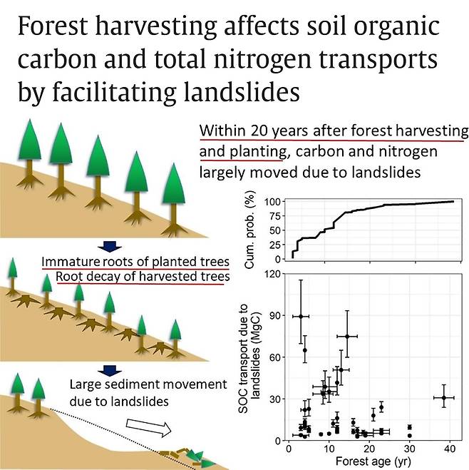 | ▲ 벌목 후 5~10년 사이에 잘린 나무의 그루터기 뿌리가 완전히 썩고, 새로 심은 나무의 뿌리가 자라 안정될 때까지 20년 동안 산사태가 발생한다고 밝힌 논문. |
