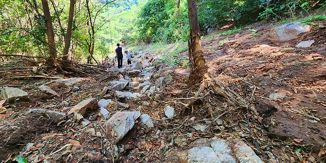 | ▲ 계곡 땅속에 있던 기반 암이 노출되도록 엄청난 토석류가 떠밀려 내려왔다. |