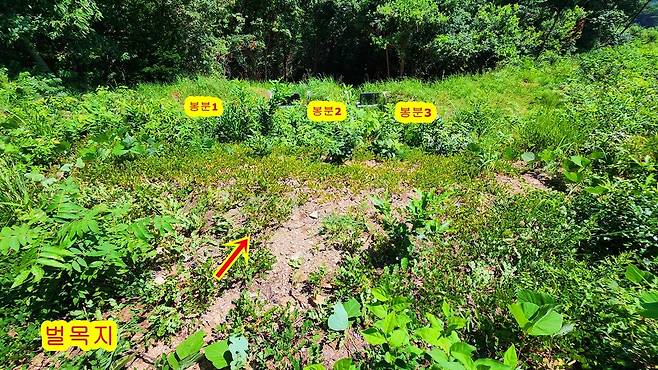 | ▲ 벌목지에 서서 무덤을 바라본 모습. 벌목지에서 빗물이 무덤으로 흘러 내려간 흔적이 그대로 남아 있다. |