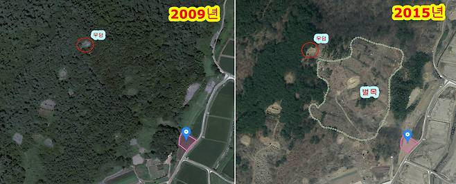 | ▲ 2009년 사진에 따르면, 산사태가 발생한 집 뒤편 사면에 숲이 울창했다. 그러나 2015년 벌목을 했다. 산사태가 발생한 무덤이 2009년 이전부터 존재했으며, 무덤 뒤에 가득했던 소나무 숲이 2024년 벌목으로 사라지며 산사태를 촉발시킨 것임을 알 수 있다. |