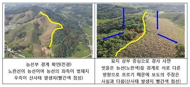 | ▲ 산사태 발생 원인이 벌채지 때문이 아니라며 산림청이 언론에 배포한 자료. 그러나 능선의 위치 표시가 잘못되었다. 산림청이 표시한 노란선은 능선이 아니라 벌목 경계선일 뿐이다. |