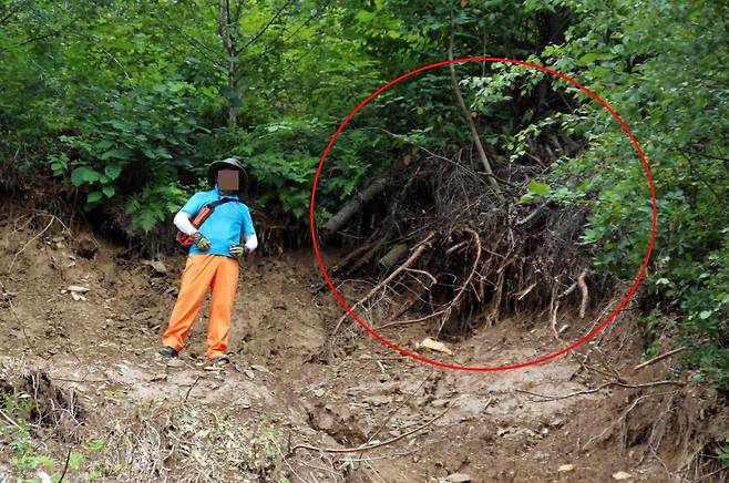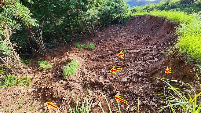 | ▲ 산사태로 무너진 무덤 봉분 바로 앞 사면에 빗물이 흘러내린 흔적이 그대로 남아 있었다. 이는 산사태 이후에도 외부에서 많은 빗물이 흘렀음을 이야기한다. |
