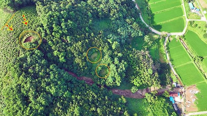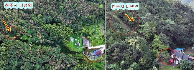 | ▲ 청주시 미원면 2017년 산사태 현장. 벌목하고 소나무 심은 곳에서 산사태가 시작되었다. 산사태가 시작된 곳에 붉은 동그라미 안에 새로 심은 어린 소나무들이 보인다. |