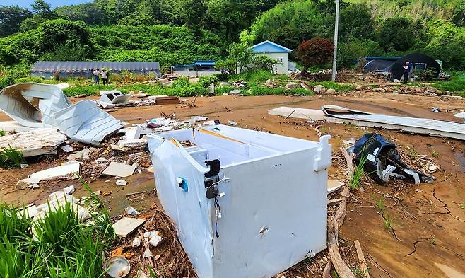 산사태의 위력이 얼마나 컸던 것일까? 커다란 양문형 냉장고가 집 아래 논까지 떠밀려 와 있었다. 문짝이 떨어져 나간 냉장고 안에는 음식들이 그대로 남아 있었다. 세탁기와 보일러 기름통과 방 문짝까지 논바닥에 뒹굴고 있었다.
