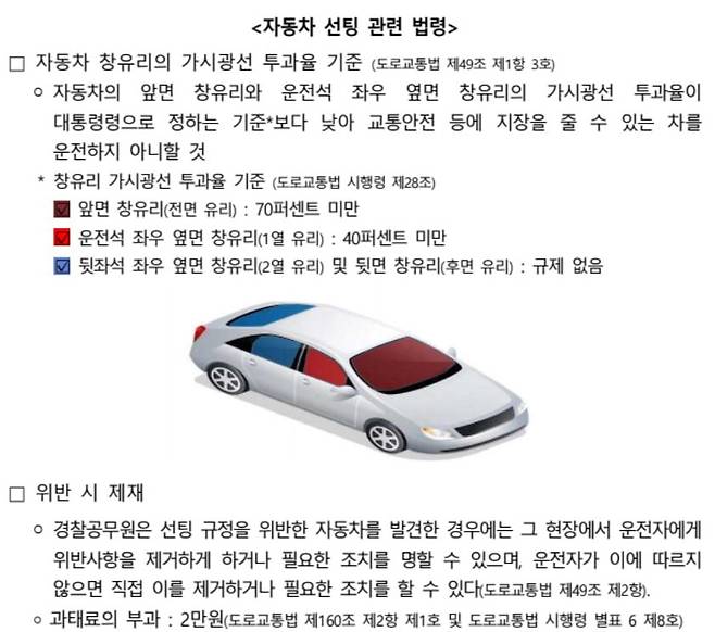 같은 법 시행령 제28조(자동차 창유리 가시광선 투과율의 기준)엔 운전이 금지되는 자동차 창유리 가시광선 투과율의 기준은 앞면 창유리 70% 미만, 운전석 좌우 옆면 창유리 40% 미만으로 기준을 정했습니다. 즉 가시광선 투과율 70% 이상인 제품을, 1열 유리면은 가시광선 투과율이 40% 이상인 제품을 선택해야 법정 가시광선 투과율 기준을 만족할 수 있습니다. (뒷좌석 창문과 후면 유리는 규제가 없습니다.) 다시 말하면 요인경호용. 구급용 및 장의용 자동차가 아니라면 국민 선팅 비율은 불법이 분명합니다.