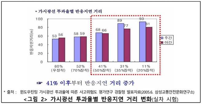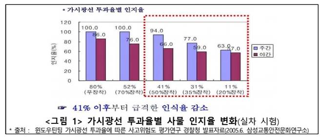 경찰청이 지난 2005년 선팅 가시광선 투과율에 따른 사고 위험도를 평가한 연구 결과에 따르면 앞면 유리의 가시광선 투과율 확보는 안전 운행을 위한 필수 요소로 가시광선 투과율이 41% 이하로 낮아질 경우 주간뿐만 아니라 야간 사물 인식률이 20% 이상 감소하고 반응 거리는 급격히 늘어나는 것으로 보고되었습니다.