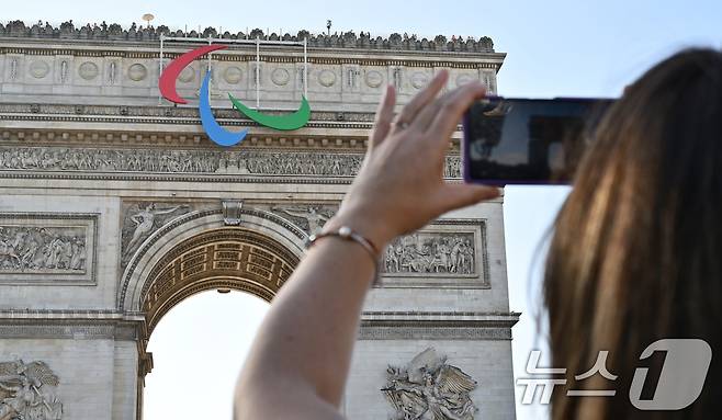 (서울=뉴스1) 사진공동취재단 = 2024 파리하계패럴림픽을 하루 앞둔 27일(현지시간) 관광객들이 패럴림픽 엠블럼 ‘아지토스’가 걸린 프랑스 파리 에투알 개선문을 배경으로 기념사진을 찍고 있다. 2024.8.28/뉴스1
