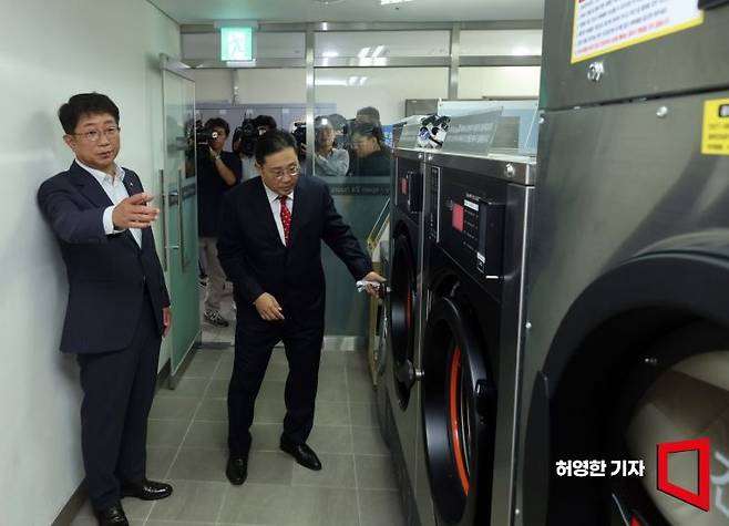 박상우 국토교통부 장관이 28일 새로운 임대주택 공급방안 현장방문으로 청년주택인 서울 용산구 ‘베르디움프렌즈’를 찾아 현장을 돌아보고 관계자들과 간담회를 가졌다. 박 장관이 커뮤니티센터 내 빨래방을 둘러보고 있다.