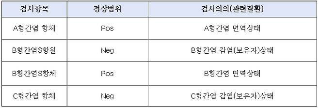 간염바이러스 표지자 검사를 통해 간염바이러스 감염 여부를 알 수 있다. 우리나라 만성 간질환의 상당 부분이 B형 또는 C형 간염바이러스 감염에 의한 것이다. B형간염 S항원이 양성이면 B형간염 바이러스에 감염된 것을 의미한다. C형간염 항체가 양성일 경우에는 C형간염바이러스 감염을 의미하지만, 위양성(감염이 아닌데 감염인 것처럼 결과가 나오는 것)일 수 있으므로 정밀검사를 통한 확인이 필요하다.