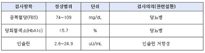 공복혈당이 126mg/dL 이상이거나 당화혈색소 6.5% 이상이면 당뇨병으로 진단한다. 공복혈당이 100~125mg/dL거나 당화혈색소가 5.7~6.4%면 당뇨병 전 단계로, 추후 당뇨병으로 진단될 위험이 높아 주의가 필요하다.
