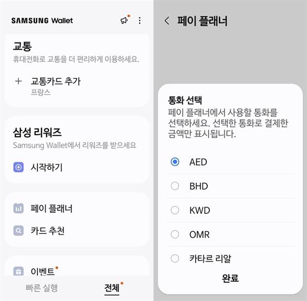 | ▲ 삼성 월렛(페이) 실행화면. 해외버전인 탓에 한국에서 사용되는 MST 기반 결제는 지원하지 않으며 국내 신용카드 또한 등록이 불가능하다. |
