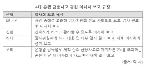 업계 관계자는 "이사회 보고 사항은 현업부서, 사무국이 정하기 나름"이라며 "이사회 승인을 받아야 하는 결의 사항은 내부 규정에 열거돼 있지만, 금융사고 관련 보고 규정은 없는 곳들이 많다. 모든 금융사고를 보고할 수 없기 때문에 '기타 필요 시 인정하는 사항'과 같은 규정으로 두는 것"이라고 설명했다. 실적 발표나 조직 개편 사항, 내부통제·감사 결과 등 정기적으로 보고되는 항목들이 있지만 금융사고의 경우 곧 바로 보고되지 않는 것이다. 사회적으로 파장이 커져서 이사회가 알아야 할 사안에 대한 판단도 은행 현업부서, 이사회 사무국에서 하기 때문에 사고를 은폐·축소하는 데 악용될 수 있다.