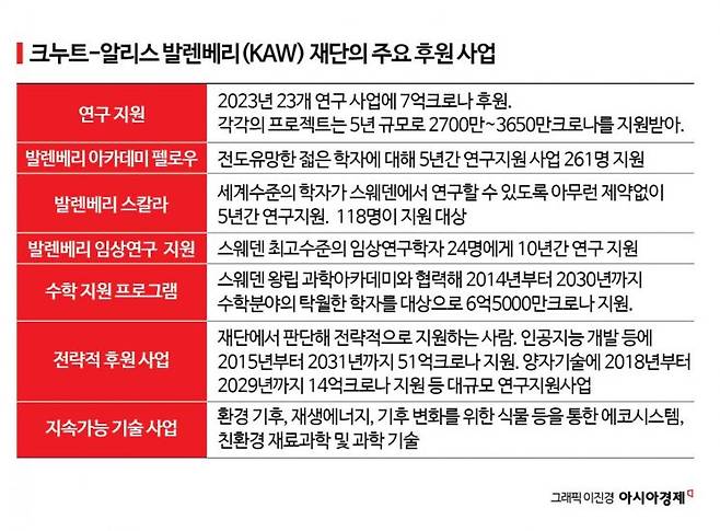 또 다른 공익재단인 마리안-마르쿠스 발렌베리 재단은 사회과학과 임상 의학 등에, 그 다음 규모인 마르쿠스-아말리아 발렌베리 재단은 인문학 등에 후원한다. 이들 재단은 후원을 받은 이들에게 어떤 ‘결과’를 내야 한다는 의무 등을 부과하지 않는다는 특징이 있다. 학계에서 ‘바보같은 아이디어’ 취급을 받더라도 타당성과 연구 필요성 등이 인정되면 실패에 대한 두려움 없이 재단의 지원을 받으며 연구를 진행할 수 있는 이유다. 발렌베리 가문의 적극적인 후원은 인구 1000만명 규모의 스웨덴을 유럽에서 손꼽히는 연구개발(R&D) 강국으로 만들었다.