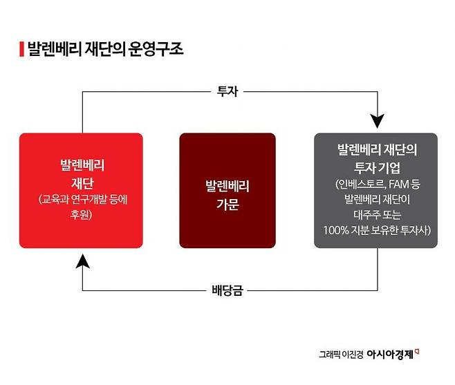 현재 발렌베리 가문이 전부 또는 일부 지분을 보유한 기업들이 벌어들이는 연간 매출은 1600억달러(213조원)에 이를 것으로 추정된다. 발렌베리 일가는 이 방대한 기업군과 관련해 비상장상사는 발렌베리 인베스트먼트, 상장사는 인베스토르와 같은 투자회사를 통해 피라미드 방식으로 그룹을 지배한다. 재단은 투자회사가 보유 중인 기업의 배당 등으로 벌어들인 수익금 가운데 80% 이상을 공익활동에 쓰고 있다. 이 때문에 발렌베리 가문의 재단은 막대한 부를 보유하고 있지만 그 가문의 구성원들은 억만장자가 없다. 스웨덴 100대 부자 등의 명단에 발렌베리 일가의 이름이 등장하지 않는 이유다.