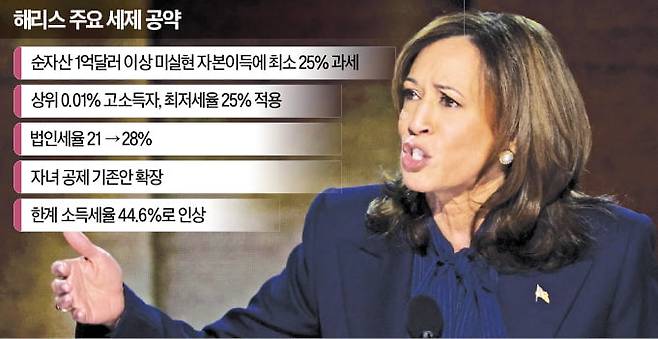 해리스 부통령 선거캠프는 개인의 최고 한계 소득세율을 44.6%로 올리는 안도 추진한다. 현재 미국에선 △자본이득 23.8% △일부 사업소득 29.6% △임금소득 39%의 최고 세율이 적용된다.